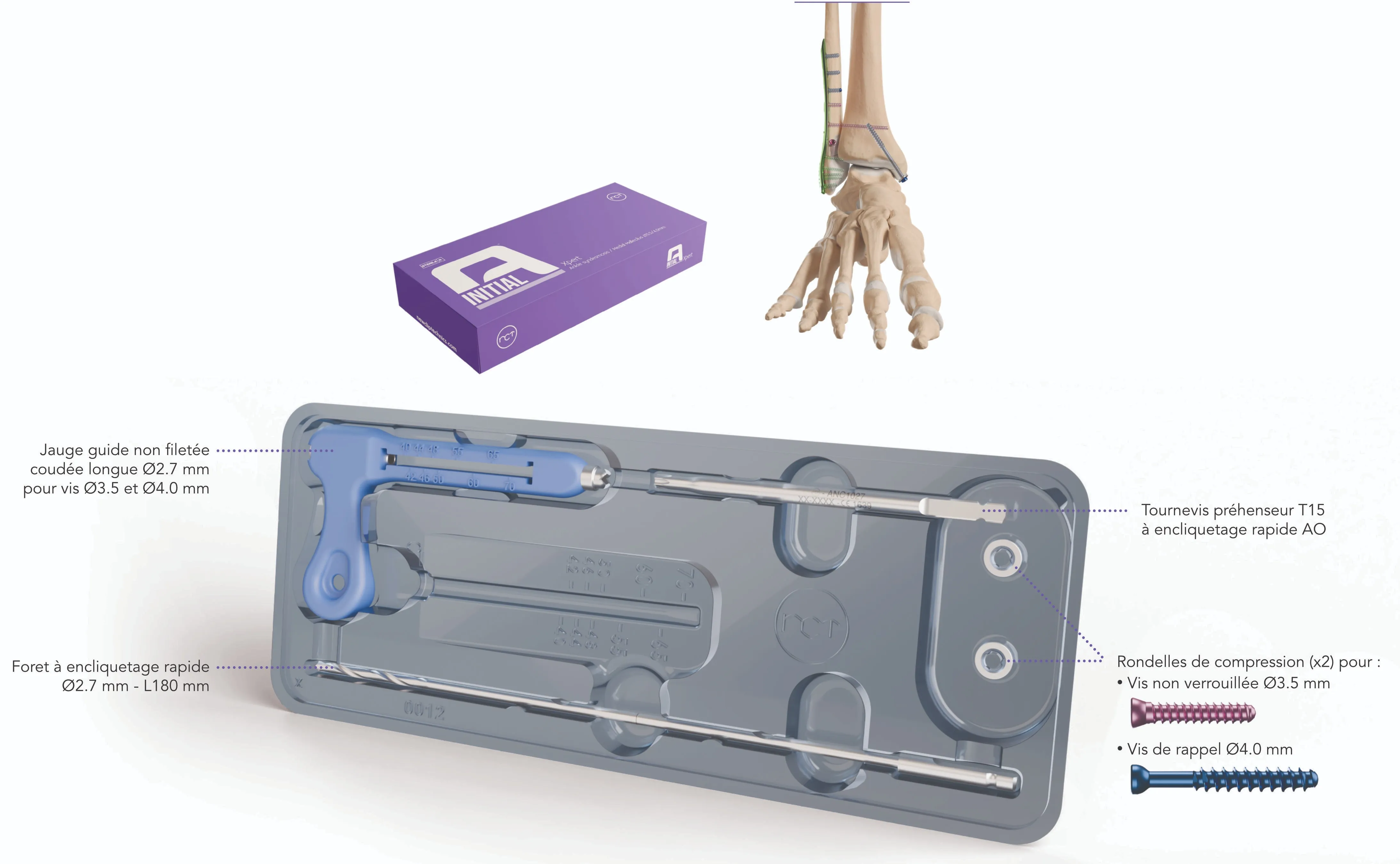 • Les kits Initial A™ Xpert - Fibula sont dédiés à la fixation des fractures, des ostéotomies et des pseudarthroses de la fibula distale et diaphysaire, ainsi que du tibia distal chez l’adulte.